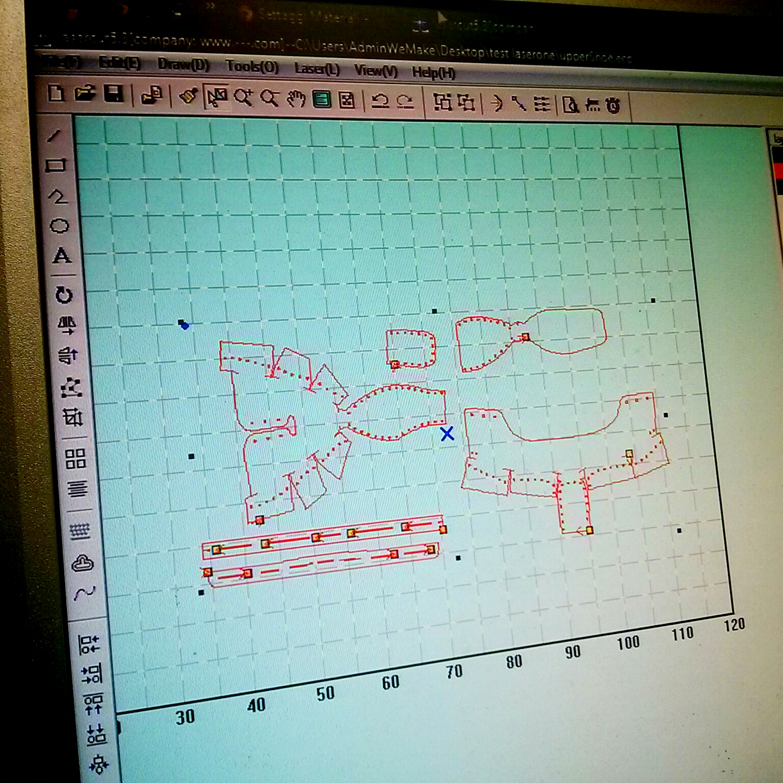 Nella sessione mattutina abbiamo lavorato al laser per individuare i settaggi della macchina adatti ai materiali: EVA (polietilene espanso) da 13mm e 5 mm per la suola interna ed esterna e pelle per la tomaia.