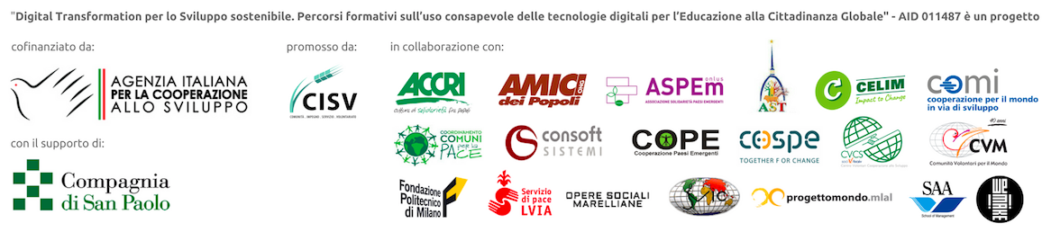 Di che si tratta? “Digital Transformation per lo Sviluppo Sostenibile. Percorsi formativi sull’uso consapevole delle tecnologie digitali per l’Educazione alla Cittadinanza Globale” è un progetto cofinanziato dall’Agenzia Italiana per la Cooperazione Internazionale e da Compagnia di San Paolo, rivolto a docenti e studenti di scuola secondaria e dell’Università, animatori e operatori del terzo settore e leader della diaspora. Il 19 giugno 2018 a Torino si è svolto il kick off di progetto .