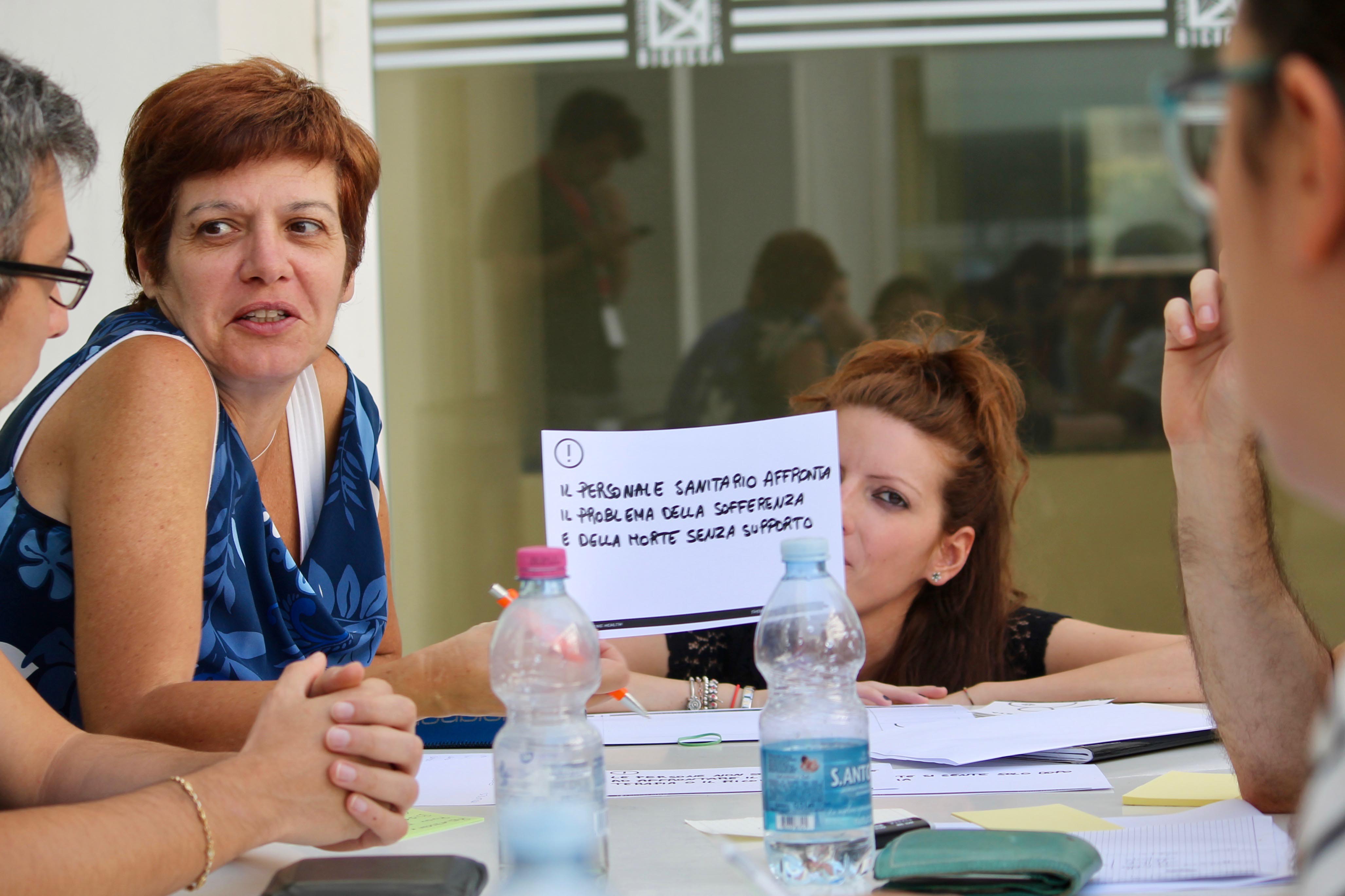 Dopo pranzo i partecipanti hanno deciso a quale sottotavolo prendere parte e le attività sono riprese. In questa fase, Co-design the Problem, sono stati utilizzate delle Carte Problemi e delle Carte Utenti, con il fine di dirigere il discorso verso una discussione contestualizzata. Durante la definizione partecipata dei problemi evidenziati abbiamo contribuito coadiuvando lo sviluppo di pensieri e trasponendo visivamente il discorso in atto su supporti facilmente visibili da tutti. Abbiamo anche messo a disposizione la conoscenza ed esperienza emersa negli scorsi mesi del progetto opencare.