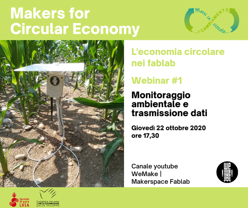 Al via la fase maker del progetto Metti In Circolo il Cambiamento, che promuove l’economia circolare, realizzato insieme a Lvia, Legambiente, Associazione Eufemia, Aics e diversi Comuni e Città metropolitane italiane. Dopo gli appuntamenti dedicati alla formazione legata ai Green jobs, nei mesi di ottobre e novembre 2020 sono in programma quattro webinar e workshop a tema economia circolare. Ci spostiamo, virtualmente e non, in Piemonte, Toscana, Emilia Romagna e Sicilia dove, insieme ai fablab locali, proponiamo differenti spunti di lavoro e ricerca.