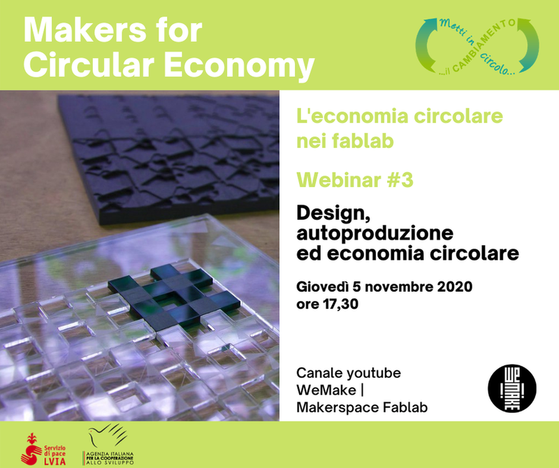 Makers for Circular Economy è l’iniziativa di WeMake che prevede 4 incontri (webinar online) legati ai temi dell’economia circolare e dell’autoproduzione maker. Durata un’ora circa. Si potrà seguire l’intero ciclo di webinar attraverso il canale YouTube di WeMake.