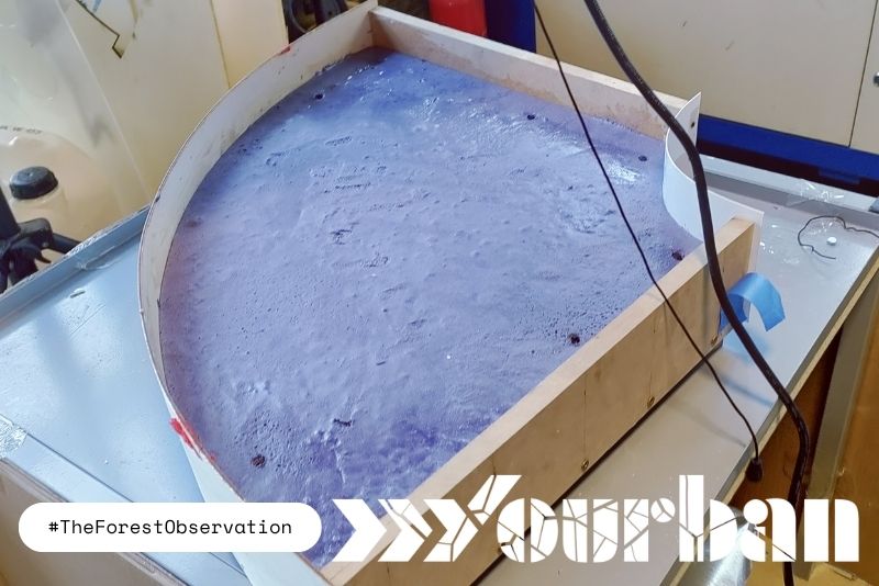 Un aspetto importante del progetto è il lavoro sui materiali, che utilizziamo come strumento narrativo. Le piattaforme incorporano delle “tracce” della foresta: i percorsi degli insetti diventano pattern tridimensionali, l’erosione dell’acqua viene tradotta in texture, e la corteccia degli alberi viene rilevata tramite scansioni e trasformata in superfici tattili. In questo modo l’osservazione diventa anche un’esperienza fisica e sensoriale.