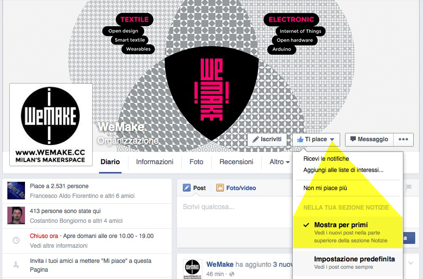 Nell’ultimo anno Facebook ha penalizzato le pagine su cui abbiamo cliccato Like (Ti Piace) e non ci ha dato controllo su cosa vedere o non vedere nel NewsFeed (Diario). Nonostante piu’ di duemila persone abbiano deciso di seguire la nostra pagina di Wemake attraverso cui comunichiamo notizie, eventi e iniziative, solo una piccola frazione riceve i nostri post perche’ era Facebook stesso a decidere cosa far vedere ai nostri Fan.