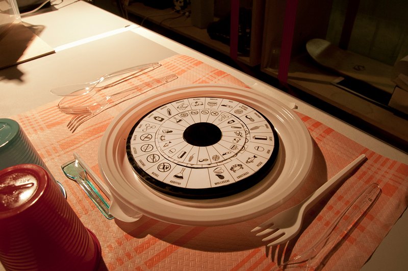 N: Il segnalatore è di forma circolare composto da due corone suddivise in settori dove sono segnalati con delle icone gli allergeni alimentari; il cliente deve girare le corone e posizionarle in corrispondenza dell’indicatore giallo segnalando le sue allergie alimentari. Fatto questo, lo appoggia vicino o sul suo piatto in modo da far vedere al cameriere quali allergie ha e favorirgli la lettura per fargli scrivere correttamente la comanda che andrà in cucina con l’ordine.