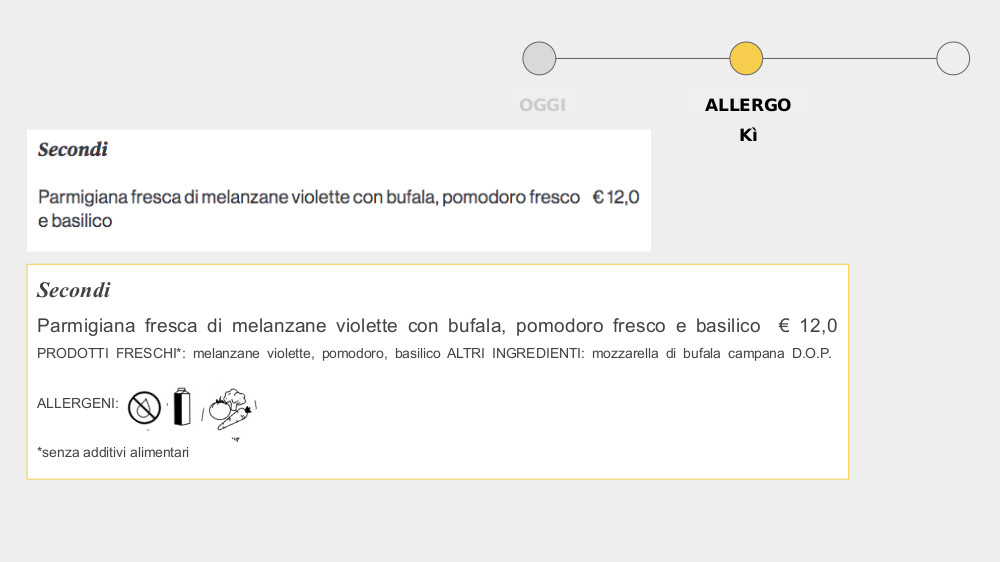 N: Grazie alla nostra esperienza e alle interviste che abbiamo fatto a diversi ristoratori abbiamo individuato un gap comunicativo tra il cliente, il personale di sala e la cucina. Il personale di sala molto spesso non sa quali allergeni contengono gli alimenti presenti nei piatti del menù o cosa fa lo staff della cucina e deve fare avanti e indietro più volte per chiedere informazioni ai cuochi. Ed è qui che vogliamo posizionarci. È proprio nel momento in cui si parlano cliente e cameriere che c’è una perdita di informazioni e con i nostri strumenti di comunicazione visiva presenti nel kit vorremmo colmare questo buco; il problema non si manifesta con il personale di cucina perché è preparato in quanto obbligato a seguire corsi sulla sicurezza alimentare.